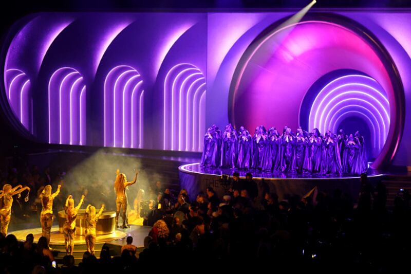67th GRAMMY Awards - Show LOS ANGELES, CALIFORNIA - FEBRUARY 02: (FOR EDITORIAL USE ONLY) Beyonce accepts the Album of the Year for “Cowboy Carter” with Blue Ivy Carter onstage during the 67th GRAMMY Awards at Crypto.com Arena on February 02, 2025 in Los Angeles, California. (Photo by Amy Sussman/Getty Images) (Amy Sussman/Getty Images)