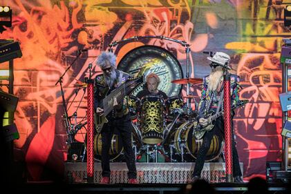 ZZ Top Perform At Viejas Casino ALPINE, CALIFORNIA - NOVEMBER 02: (L-R) Elwood Francis, Frank Beard, and Billy Gibbons of ZZ Top perform on stage at Viejas Casino & Resort on November 02, 2025 in Alpine, California. (Photo by Daniel Knighton/Getty Images) (Daniel Knighton/Getty Images)