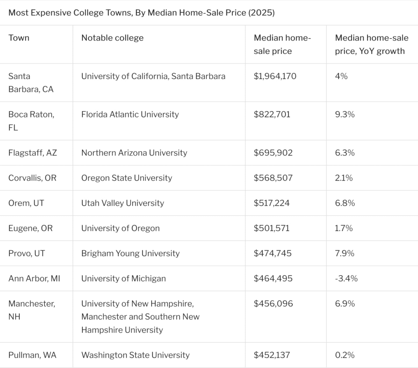Housing data is a weighted average from January to July 2025. Income data comes from the U.S. Census Bureau 2024 ACS 1-year estimate. Tuition data comes from College Board and assumes average financial aid. For information about housing markets in additional college towns, read this.