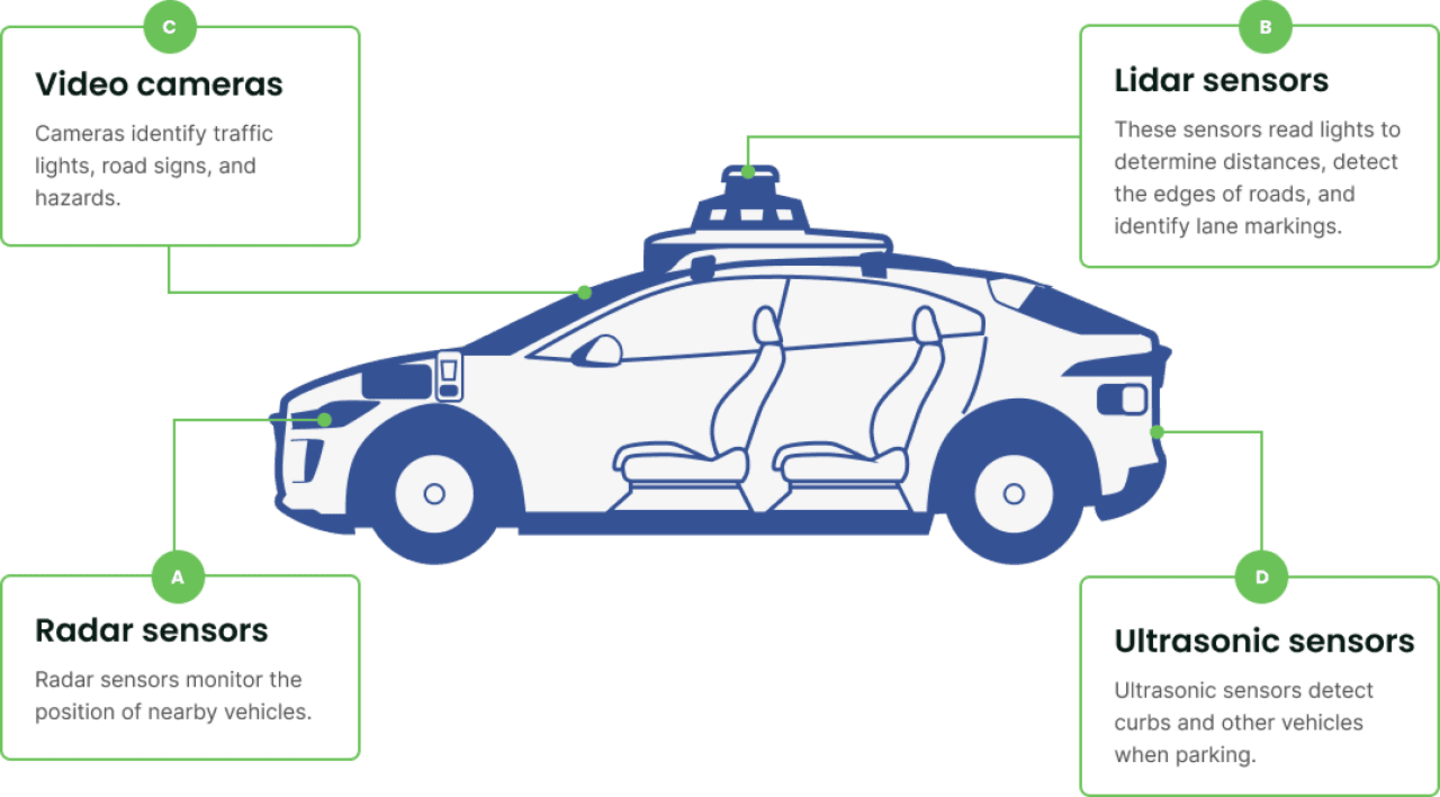 Autonomous vehicles are typically equipped with many different sensors. Sensors monitor various data points and feed this information into the vehicle’s computer. There may be several sensors in the vehicle, including: