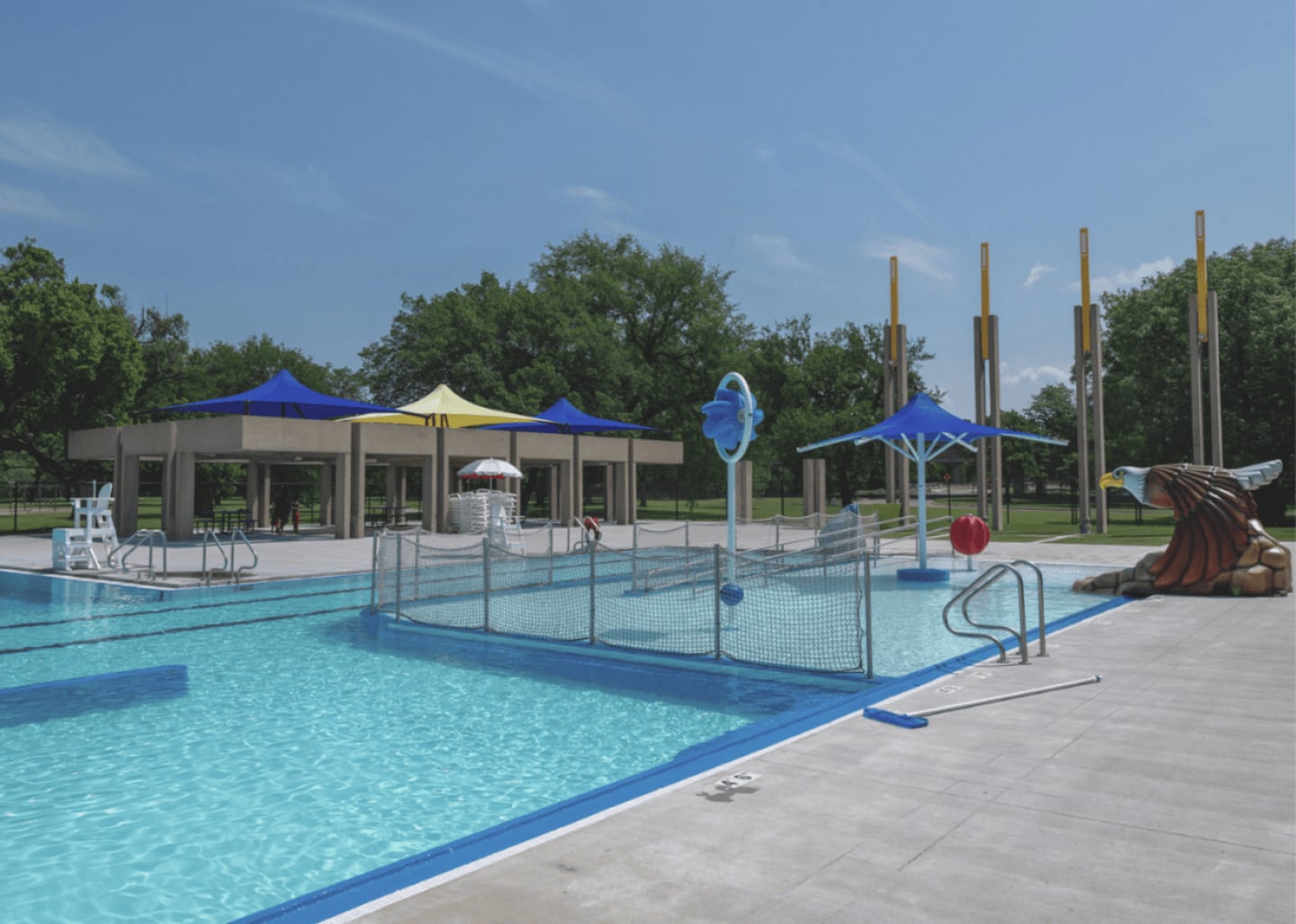 The pool, built in a historically Black neighborhood, was one of the first to offer Black swimmers in Kansas access to competition-length swimming lanes. It featured double sand-blasted concrete shade structures that provided shelter from the heat and concrete light towers for those looking to swim at night. Its modular concrete and brick pool house also offered a minimalist environment for showering and changing clothes.