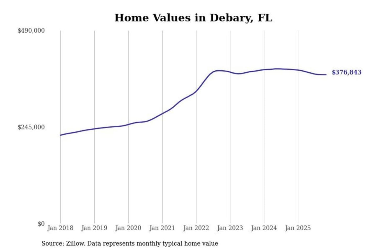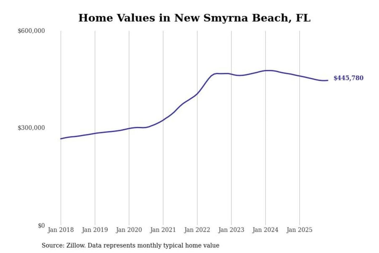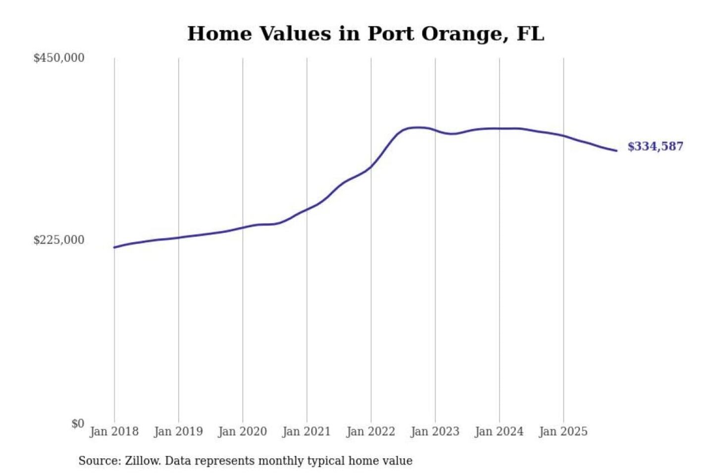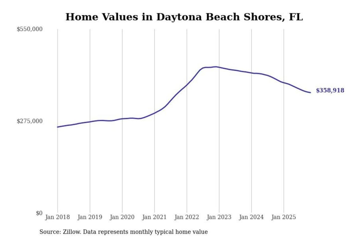 Stacker compiled a list of cities with the most expensive homes in the Deltona-Daytona Beach-Ormond Beach, FL metro area using data from Zillow. Charts show the monthly typical home value since January 2018.