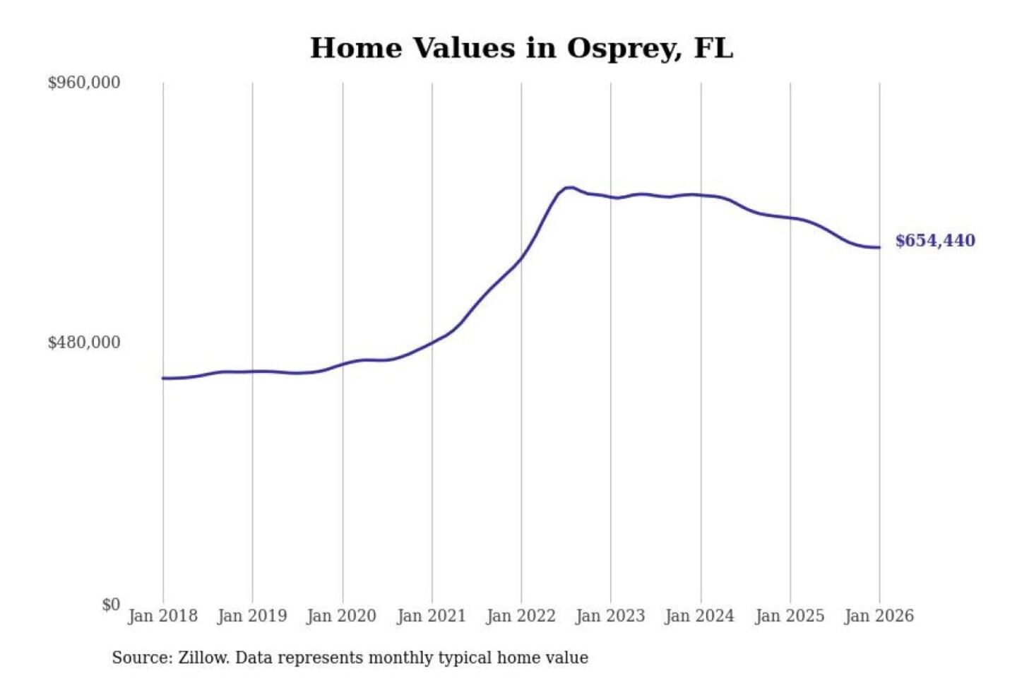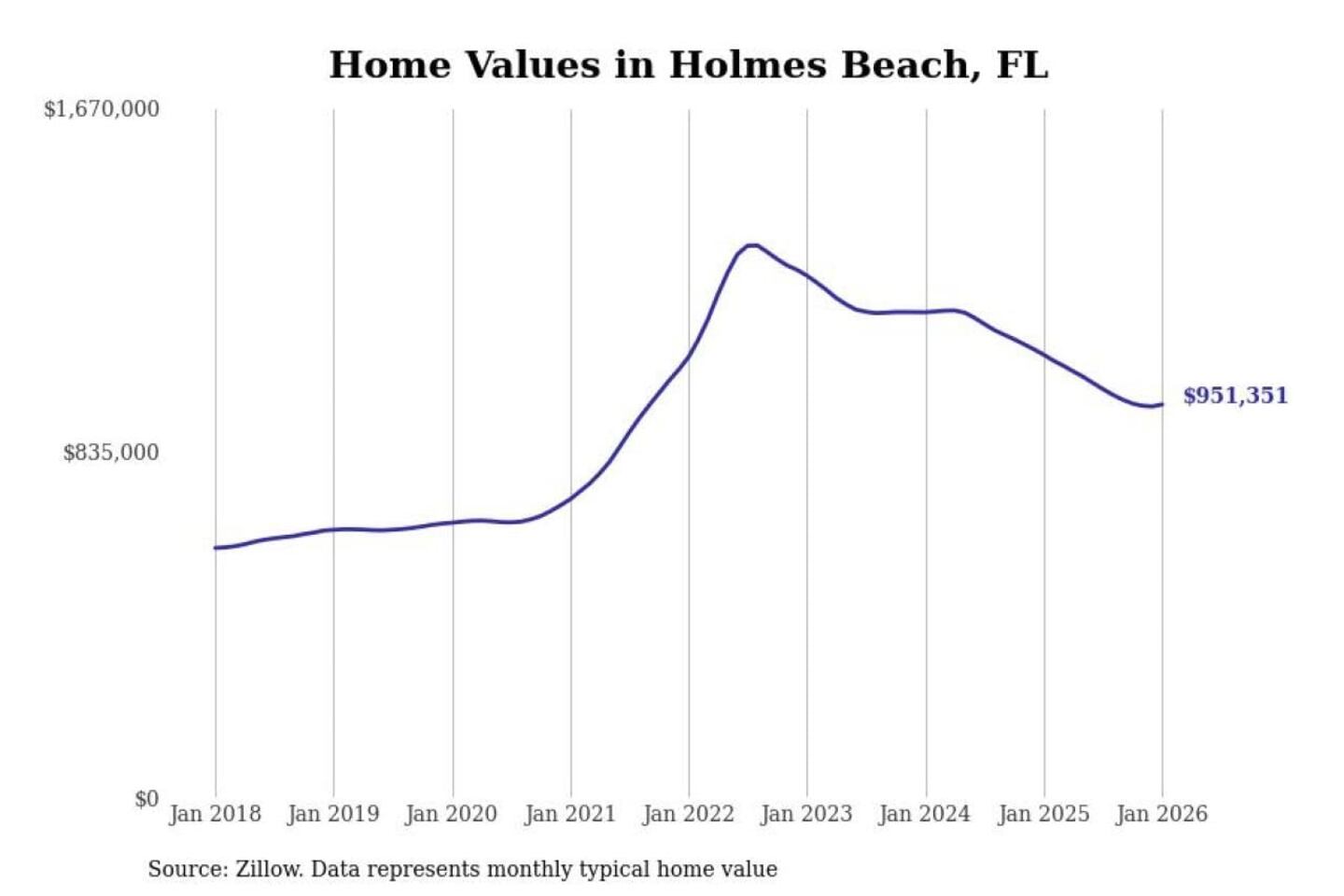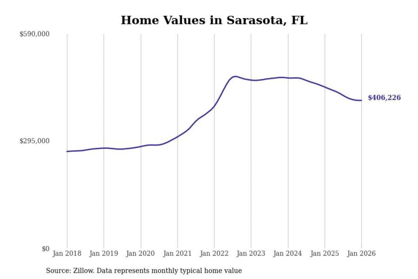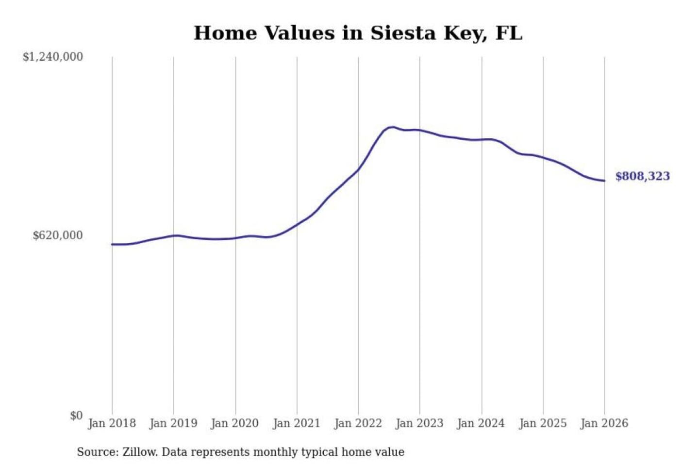 Stacker compiled a list of cities with the most expensive homes in the North Port-Sarasota-Bradenton, FL metro area using data from Zillow. Charts show the monthly typical home value since January 2018.