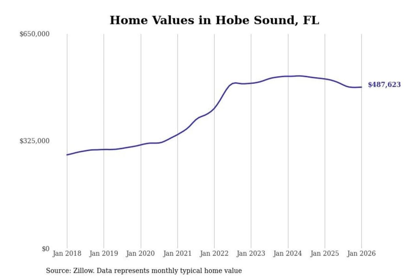 Stacker compiled a list of cities with the most expensive homes in the Port St. Lucie, FL metro area using data from Zillow. Charts show the monthly typical home value since January 2018.