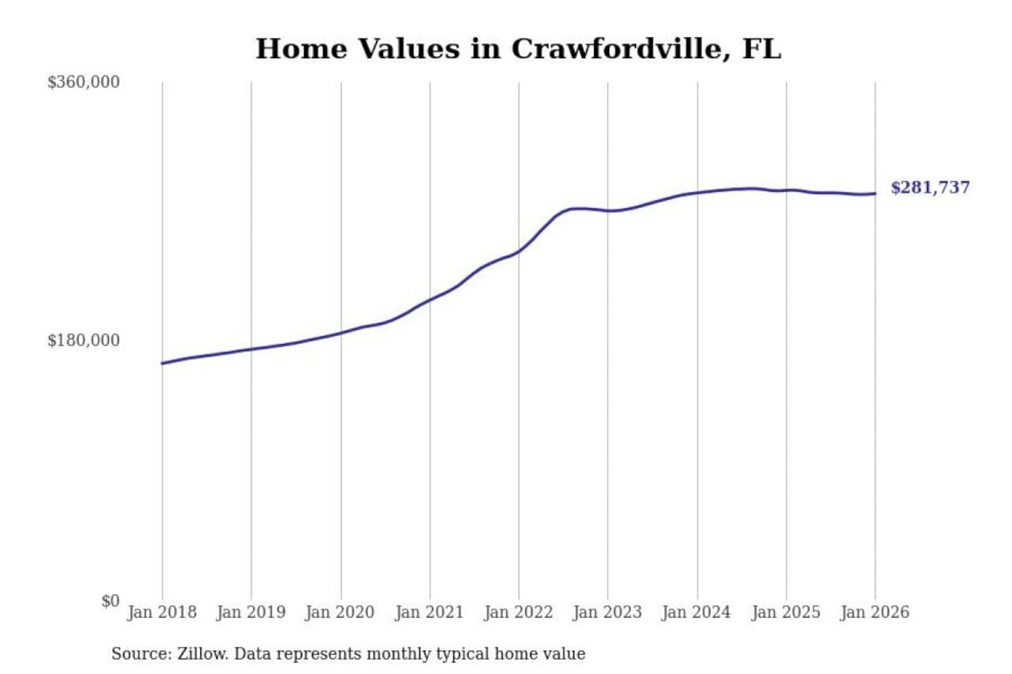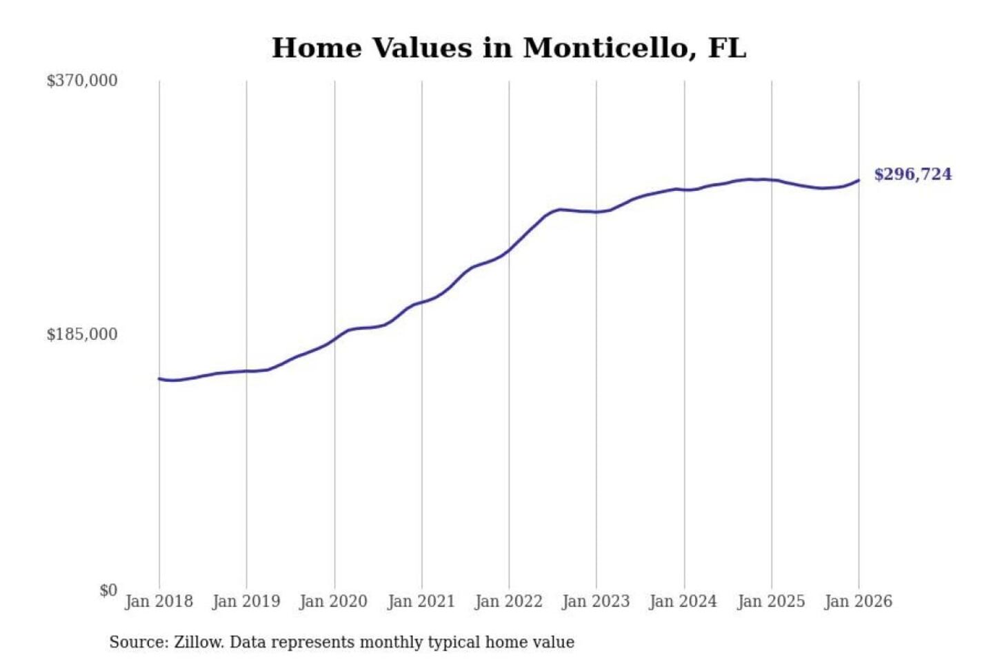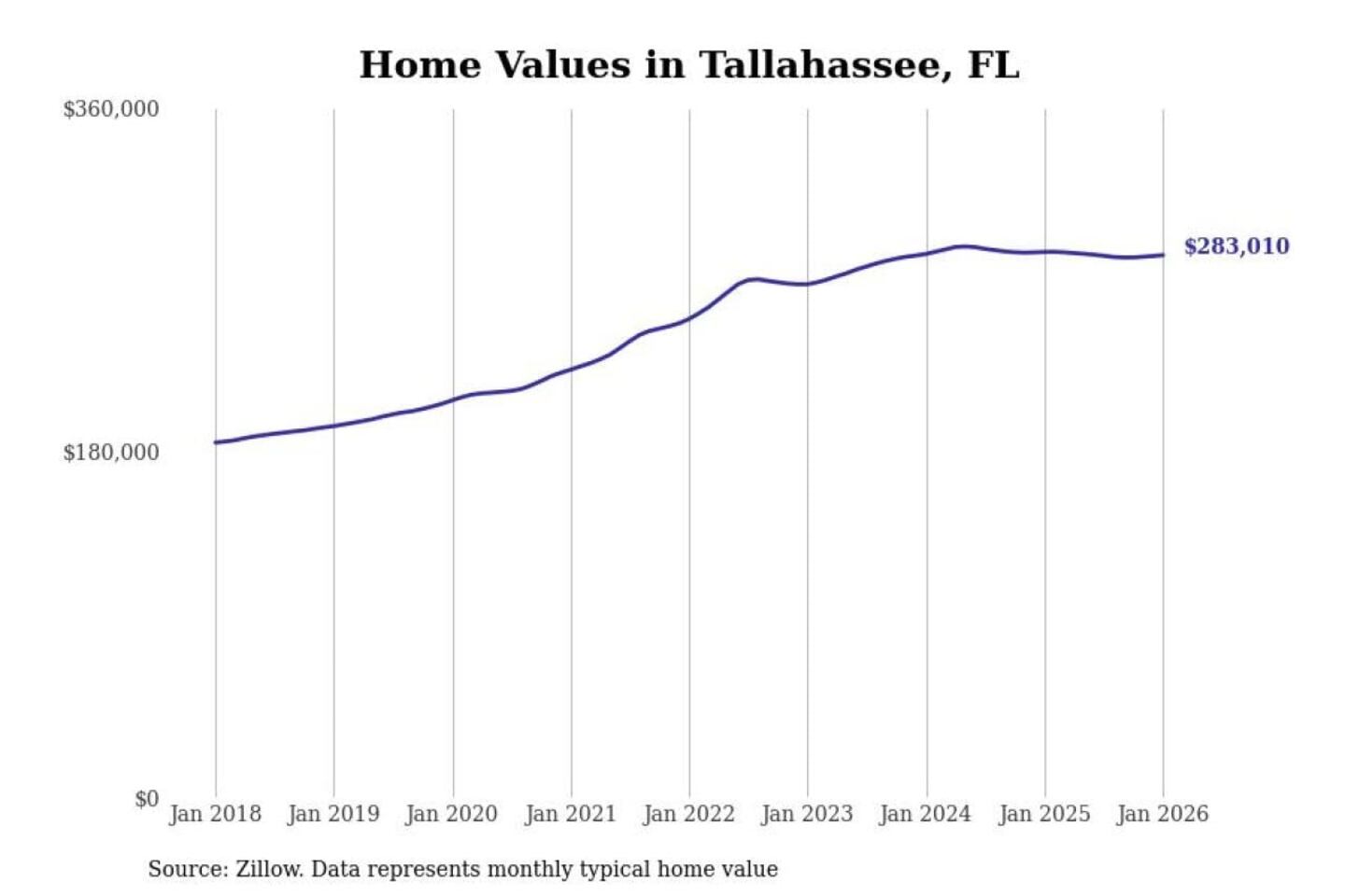 Stacker compiled a list of cities with the most expensive homes in the Tallahassee, FL metro area using data from Zillow. Charts show the monthly typical home value since January 2018.