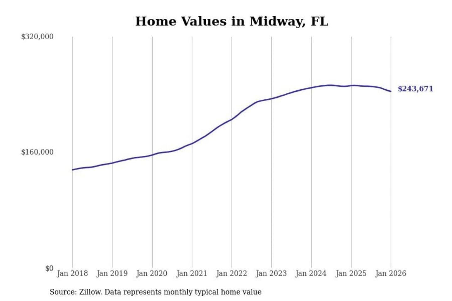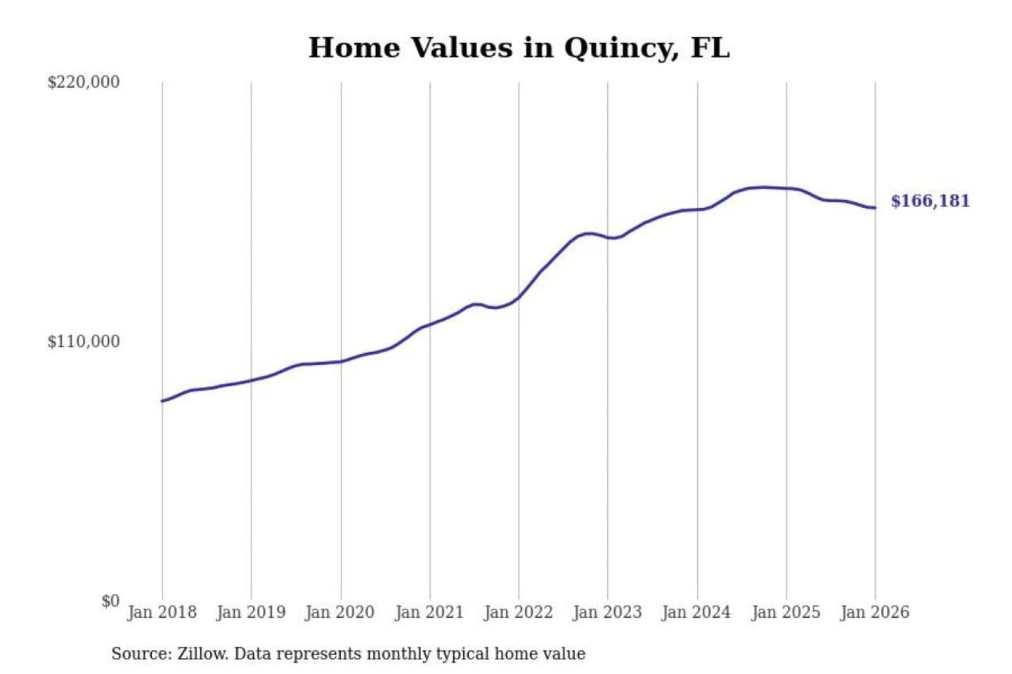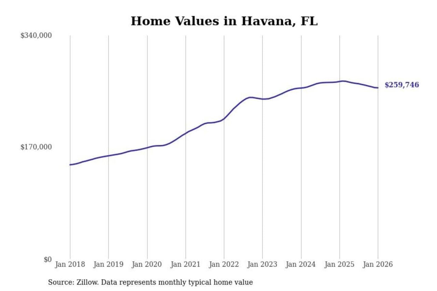 Stacker compiled a list of cities with the most expensive homes in the Tallahassee, FL metro area using data from Zillow. Charts show the monthly typical home value since January 2018.