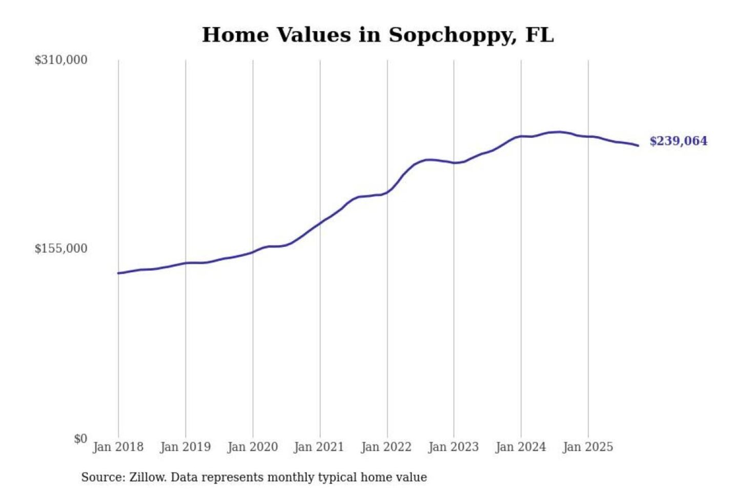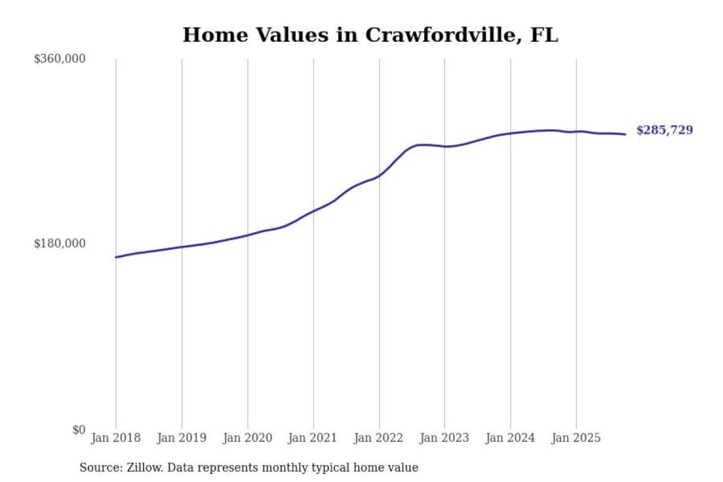 Stacker compiled a list of cities with the most expensive homes in the Tallahassee metro area using data from Zillow. Charts show the monthly typical home value since January 2018. All 11 cities and towns with data available were included in the list.