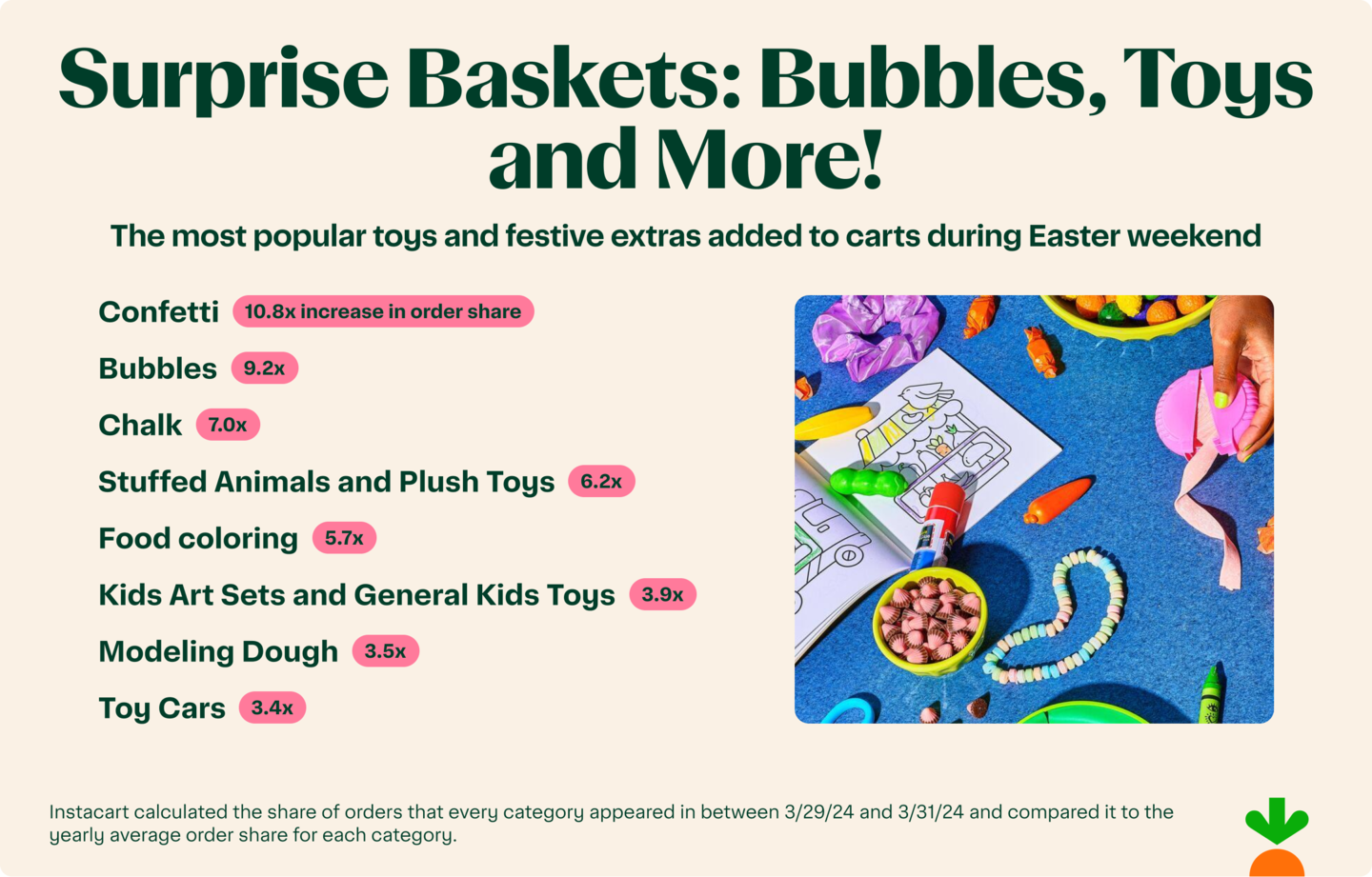 Beyond chocolate eggs and bunnies, Easter is a great way to welcome spring with fun activities like blowing bubbles and enjoying outdoor or seasonal toys. According to Instacart's data, bubble wands and related products soared in popularity during Easter, with a 9.2x rise in purchases compared to the yearly average.