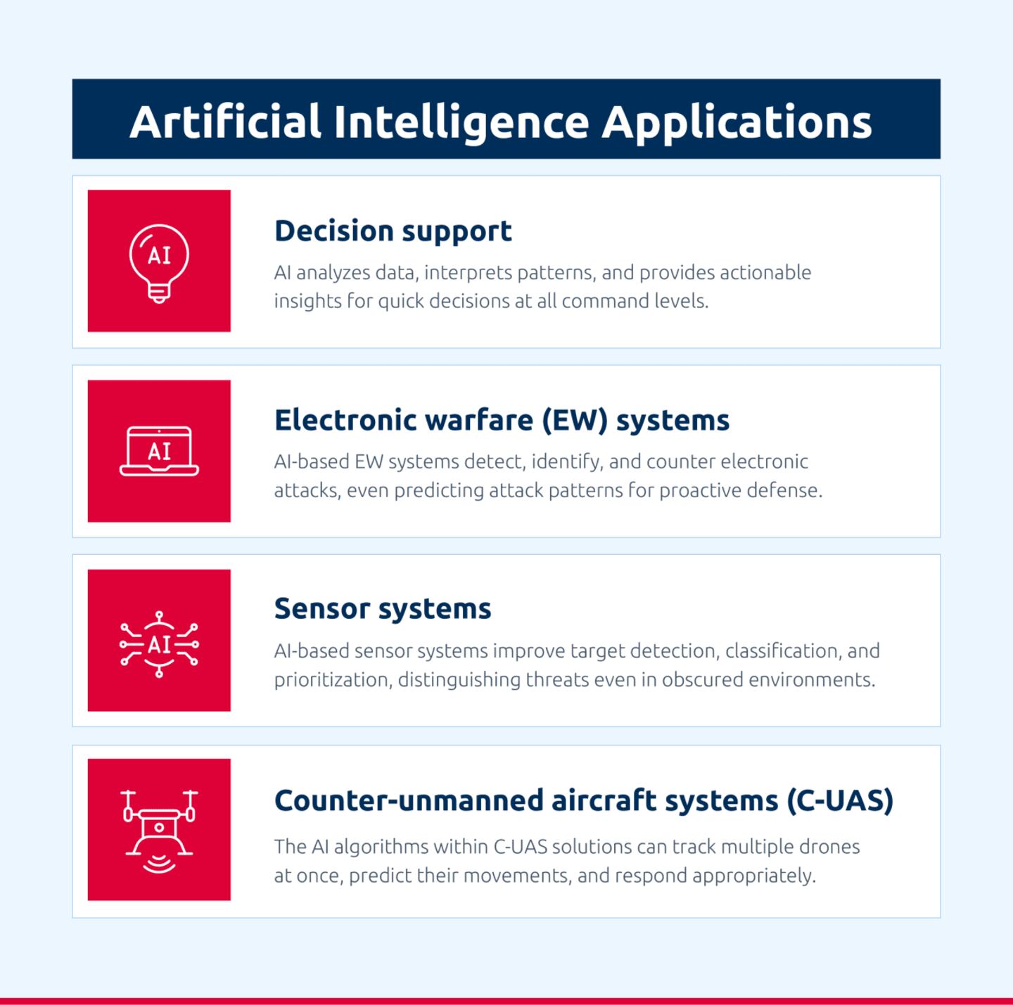 - Counter-unmanned aircraft systems (C-UAS): C-UAS can equip vehicles for defense against AI-driven drone swarms. The AI algorithms within C-UAS solutions can track multiple drones at once, predict their movements, and respond appropriately. Responses could include jamming the drones' communication lines or deploying kinetic interceptors.