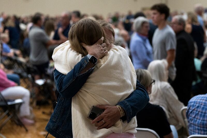 Vigil RICHFIELD, MINNESOTA - AUGUST 27: Attendees embrace at a vigil following a mass shooting at Annunciation Catholic School on August 27, 2025 in Richfield, Minnesota. According to Minneapolis Police, a gunman fired through the windows of the Annunciation Church at worshippers sitting in pews during a Catholic school Mass, killing two children and injuring at least 17 others. The gunman reportedly died at the scene from a self-inflicted gunshot wound. (Photo by Stephen Maturen/Getty Images) (Stephen Maturen/Getty Images)
