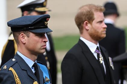 September 2022 LONDON, ENGLAND - SEPTEMBER 19: Prince William, Prince of Wales and Prince Harry, Duke of Sussex follow behind The Queen's funeral cortege borne on the State Gun Carriage of the Royal Navy as it leaves Westminster Abbey on September 19, 2022 in London, England. Elizabeth Alexandra Mary Windsor was born in Bruton Street, Mayfair, London on 21 April 1926. She married Prince Philip in 1947 and ascended the throne of the United Kingdom and Commonwealth on 6 February 1952 after the death of her Father, King George VI. Queen Elizabeth II died at Balmoral Castle in Scotland on September 8, 2022, and is succeeded by her eldest son, King Charles III. (Photo by Jeff Spicer/Getty Images) (Jeff Spicer/Getty Images)