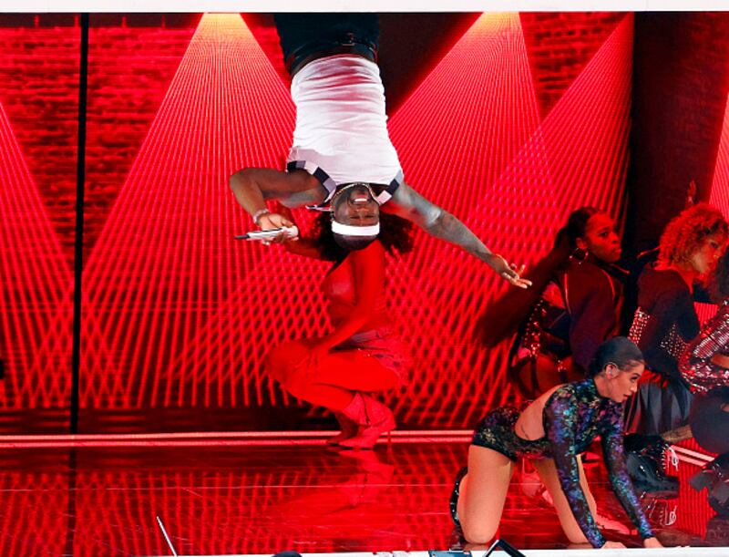 Then, 50 Cent, not among the announced performers, started his “In Da Club” while hanging upside inside one of the rooms.