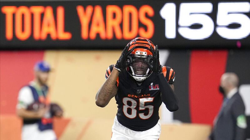 Super Bowl LVI Tee Higgins reacts after scoring on a 75-yard touchdown pass 12 seconds into the second half. (Marcio Jose Sanchez/Associated Press)