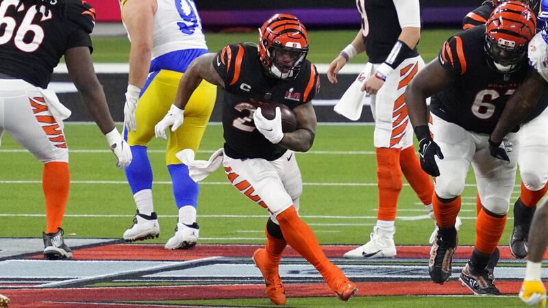 Super Bowl LVI Bengals running back Joe Mixon looks for running room during the third quarter. (Julio Cortez/Associated Press)