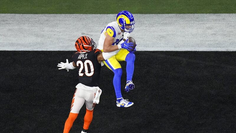 Game winner: The Rams' Cooper Kupp makes the game-winning catch over Eli Apple with 1:25 left in Super Bowl LVI. (Marcio Jose Sanchez/Associated Press )