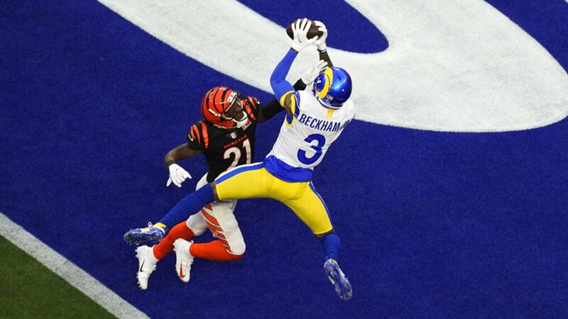 Super Bowl LVI Rams wide receiver Odell Beckham Jr. (3) grabs a 17-yard touchdown pass over Bengals cornerback Mike Hilton (21) in the first quarter. (Matt Rourke/Associated Press)