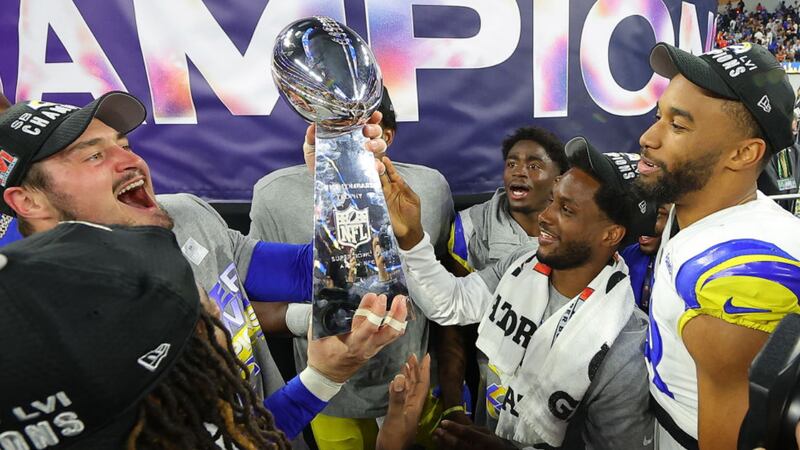 Super Bowl LVI Rams players enjoy themselves while holding the Vince Lombardi Trophy. ( Kevin C. Cox/Getty Images)