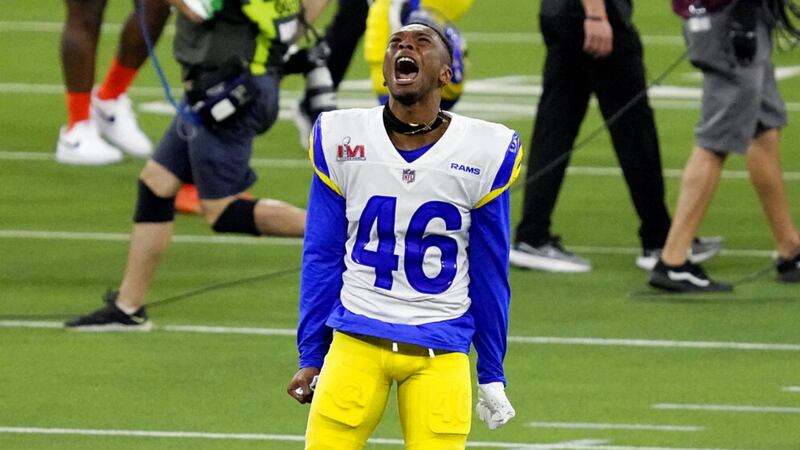 Super Bowl LVI Rams defensive back Grant Haley celebrates after Los Angeles won Super Bowl LVI. (Julio Cortez/Associated Press)