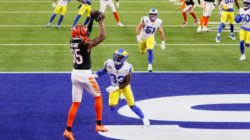 Super Bowl LVI Cincinnati's Tee Higgins (85) catches a touchdown pass from Joe Mixon over Nick Scott (33) of the Los Angeles Rams during the second quarter. (Steph Chambers/Getty Images)