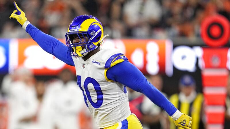 Super Bowl LVI Los Angeles Rams outside linebacker Von Miller reacts after sacking Cincinnati Bengals quarterback Joe Burrow. (Marcio Jose Sanchez/Associated Press)