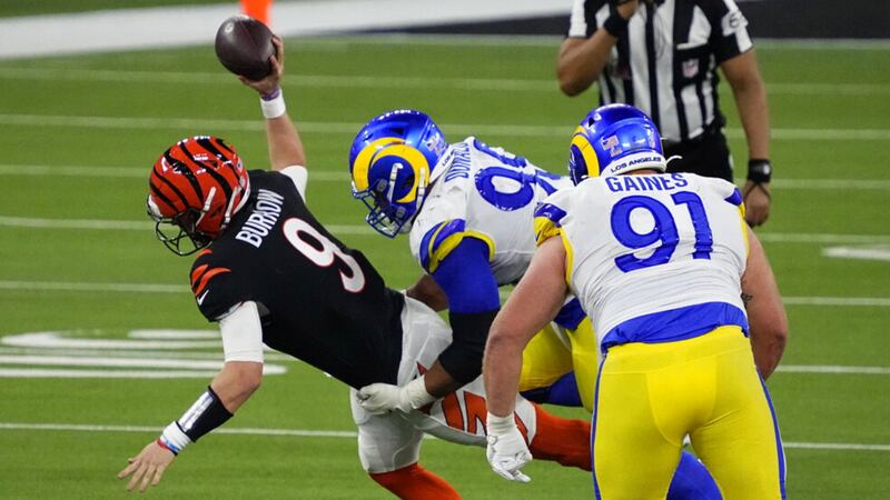 Super Bowl LVI Cincinnati's Trey Hendrickson, left, sacks the Rams' Matthew Stafford on the game's first series. ( Rob Carr/Getty Images)