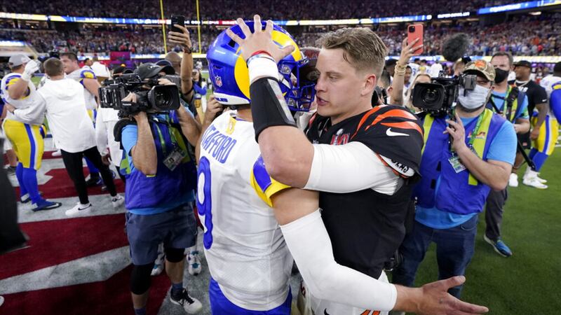 Super Bowl LVI Joe Burrow, right, congratulates Matthew Stafford after the Rams edged the Bengals in Super Bowl LVI. (Mark J. Terrill/Associated Press)