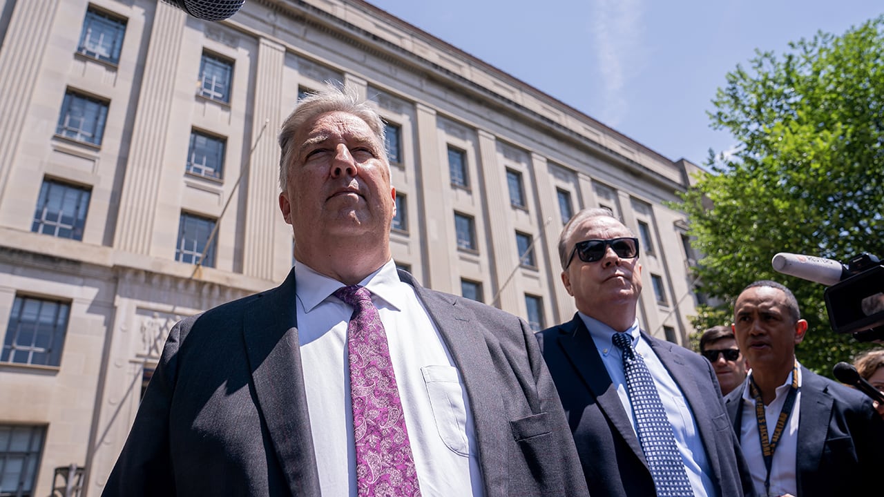 James Trusty, John Rowley James Trusty, left, and John Rowley, center, attorneys for former President Donald Trump, exit the Department of Justice in Washington, DC, US, on Monday, June 5, 2023. (Nathan Howard/Bloomberg via Getty Images, File)