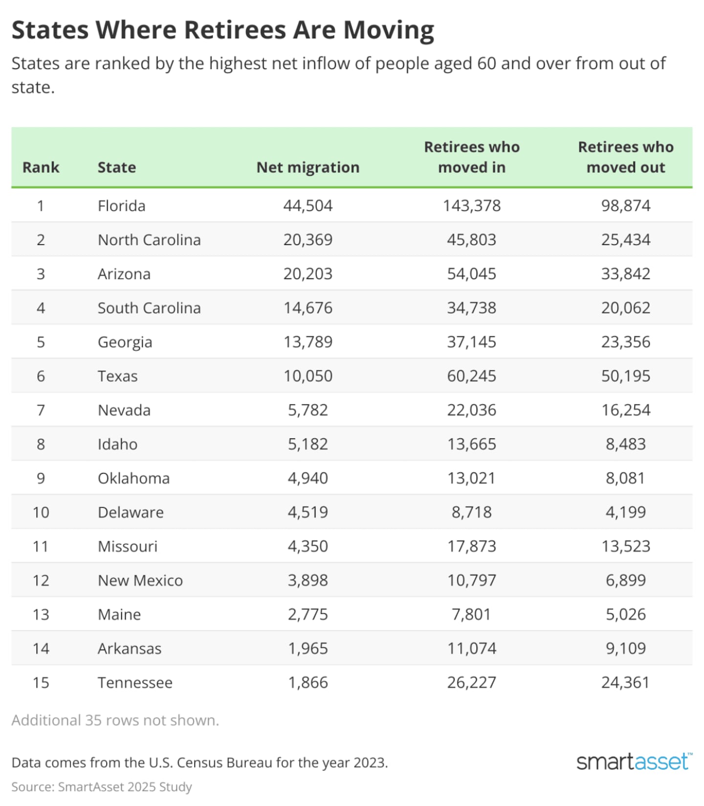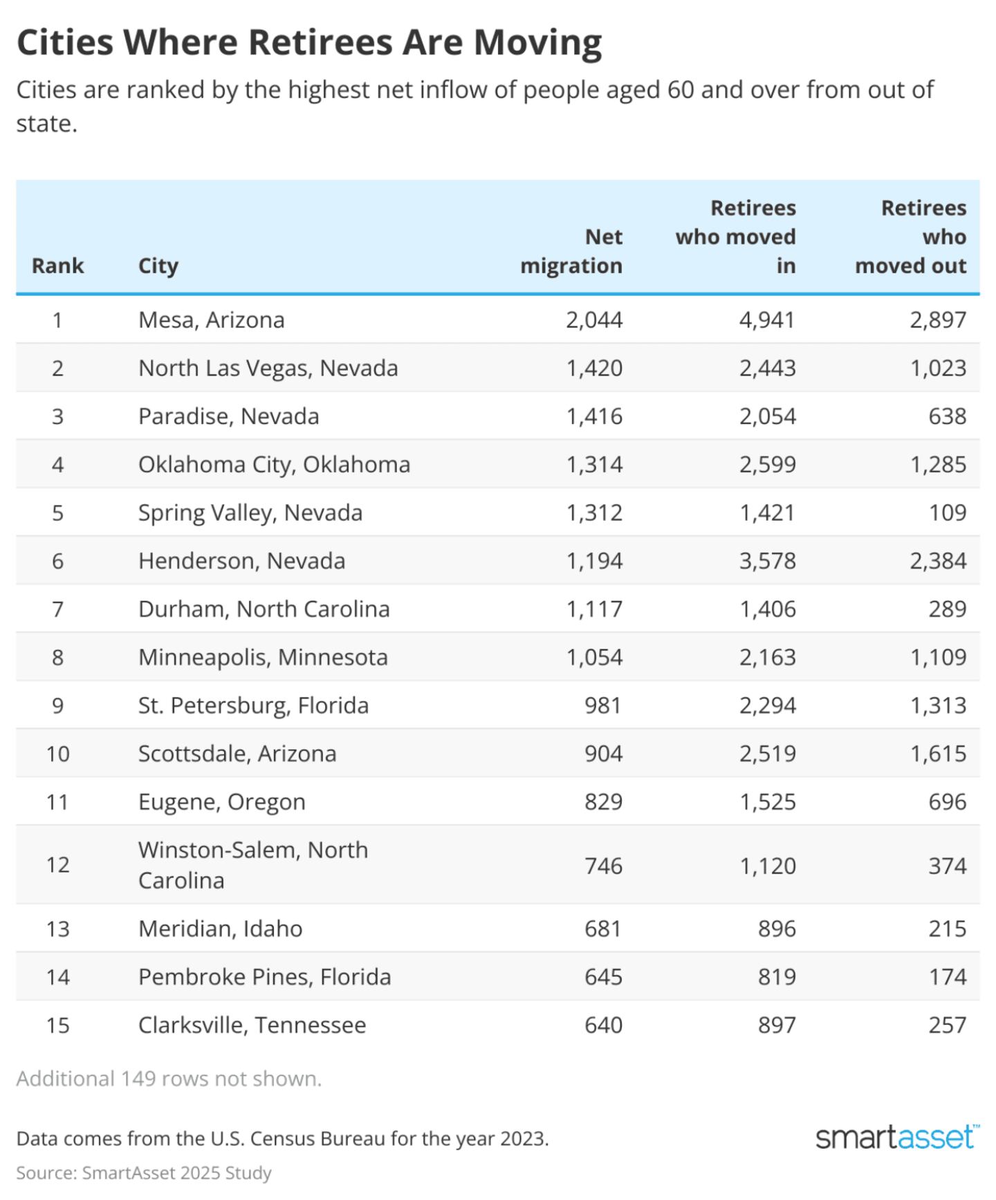 With this in mind, SmartAsset ranked 164 of the largest U.S. cities and all 50 states based on the net number of retirees — assumed to be people ages 60 and over — moving in.