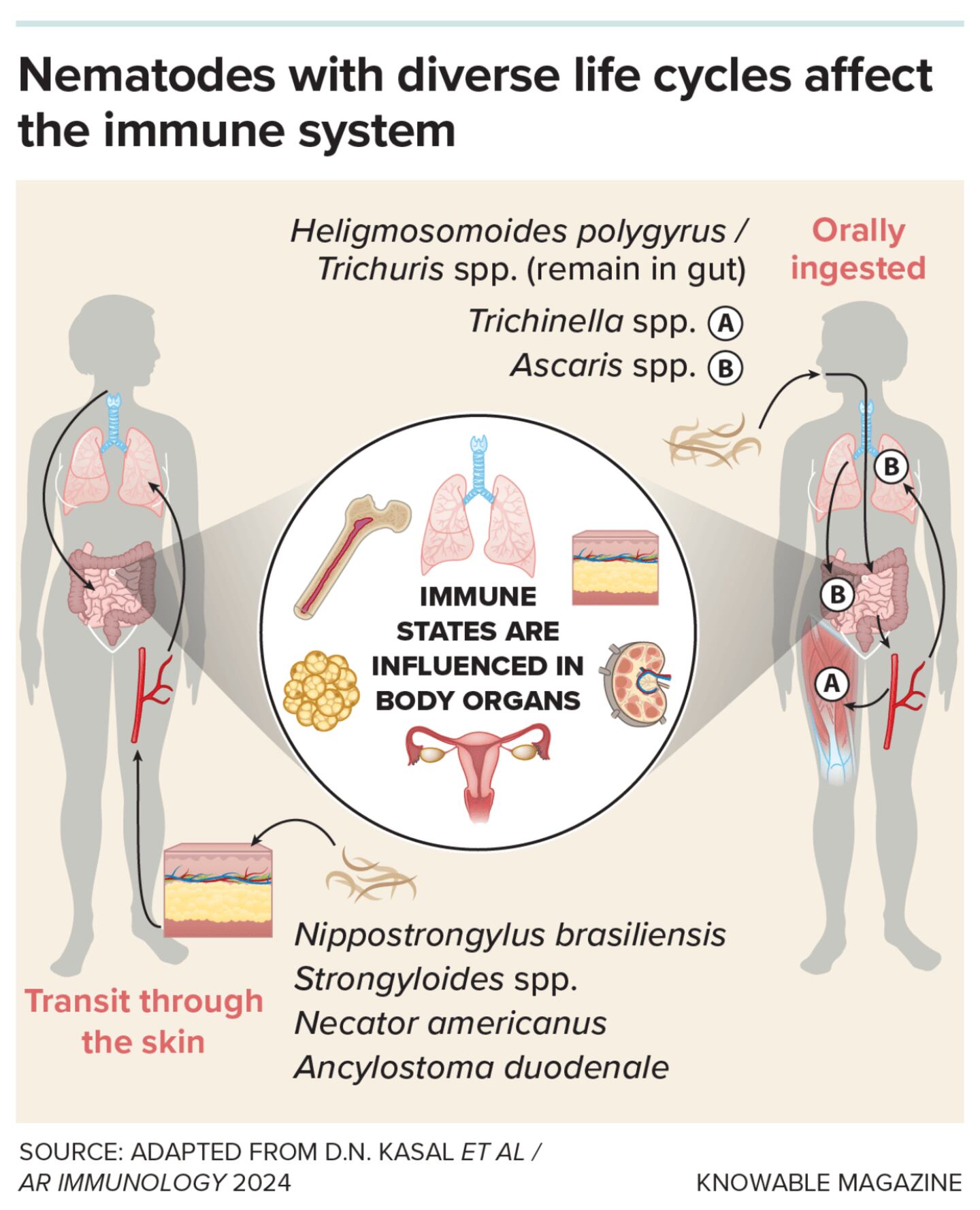While it's true that worms gobble up food their hosts might otherwise digest, that doesn't seem to be the only mechanism at work here. There's also some intricate biology within the emerging scientific field of immunometabolism. Knowable Magazine breaks down what researchers' work with worms could mean for future medical treatments.